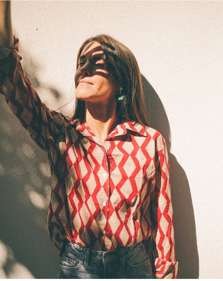 Camisa de manga larga en algodón orgánico con un llamativo estampado geométrico en tonos rojos y beige. Esta pieza única destaca por su diseño moderno y versátil, ideal para quienes buscan una prenda con personalidad.
